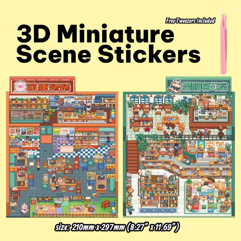 3D Scene Stickers – 4-Pack DIY Stress Relief Stickers (Coffee Shop, Ice Cream Store)